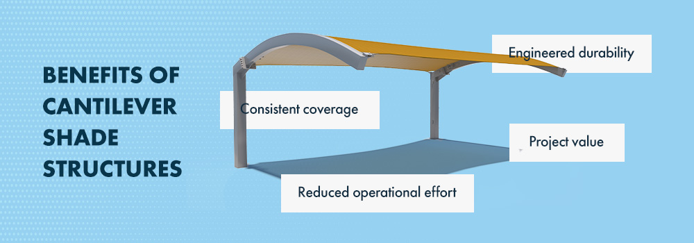 Cantilever shade structures are often selected when a project requires durability, consistent coverage and long-term reliability. The side-post design allows large areas to remain open and usable while still delivering shade. This design works especially well in spaces where activity happens directly beneath the canopy.