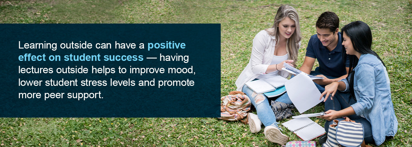Learning outside can have a positive effect on student success — having lectures outside helps to improve mood, lower student stress levels and promote more peer support. These spaces also allow educators to take on flexible learning approaches they can’t do indoors, helping them create a multi-faceted learning experience for students.