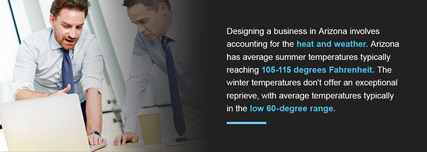 Designing a business in Arizona involves accounting for the heat and weather. Arizona has average summer temperatures typically reaching 105-115 degrees Fahrenheit. The winter temperatures don’t offer an exceptional reprieve, with average temperatures typically in the low 60-degree range.