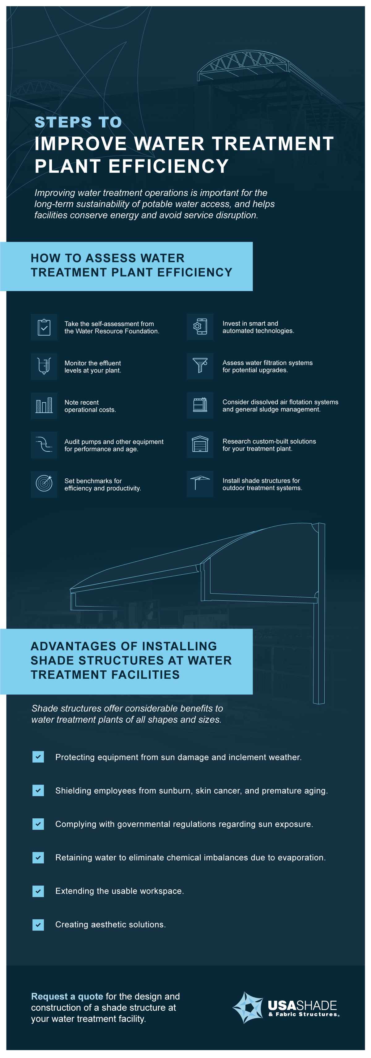 - Research other efficiency and productivity innovations. In addition to pump upgrades and the implementation of new technologies and smart tech automation systems, water treatment facilities can also benefit more out-of-the-box and/or custom-built solutions in order to address specific needs and functions on a plant-by-plant basis. This can include more innovative solutions such as shade structures. Each water treatment plant will have its own unique problems and considerations, so plant owners and managers should keep this in mind throughout their assessment(s), as well as when searching for dynamic solutions. There are always new programs and technological systems entering the market, so frequent research can be key to staying abreast of new developments as they occur.