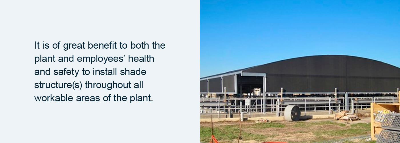 - Complying with governmental regulations. Often, some protection against sun exposure is mandated by federal, state and/or local laws. These regulations may be monitored by the local health department, or the Occupational Safety and Health Administration (OSHA). Consequently, if a plant fails to provide these protections to its employees, it may face considerable legal and/or monetary penalties due to OSHA and/or health department non-compliance. As such, it is of great benefit to both the plant and employees’ health and safety to install shade structure(s) throughout all workable areas of the plant.