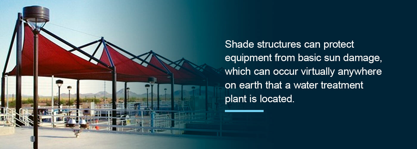 - Protecting equipment. Perhaps the most obvious benefit of installing a shade structure over a water treatment facility will be its capacity to protect equipment such as outdoor tanks, treatment rooms, pumps, filtration systems and other storage facilities. This protection can be especially valuable in locales with inclement weather, like icy, snowy winters and/or extreme heat in the summer. However, the equipment protection afforded by a shade structure is not limited to plants in extreme climates. These structures can also protect equipment from basic sun damage, which can occur virtually anywhere on earth that a water treatment plant is located.