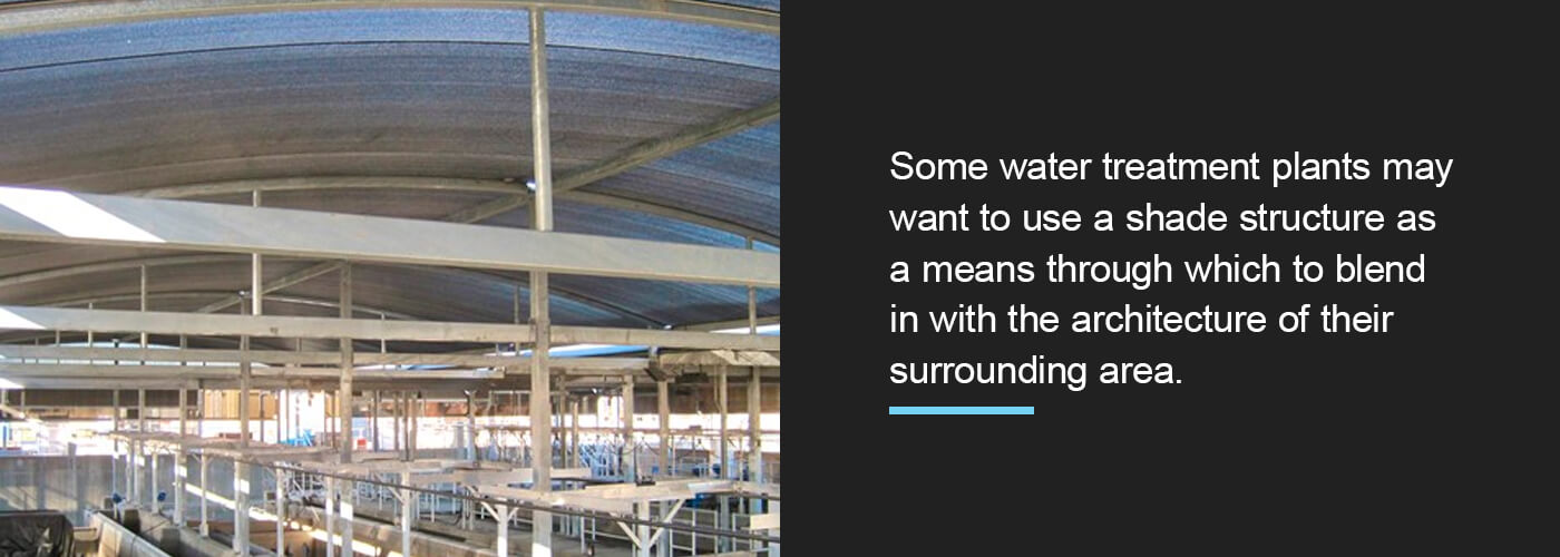 - Creating aesthetic solutions. Though critically important to the communities that they serve, water treatment plants are not known for being visually appealing. Some water treatment plants may want to use a shade structure as a means through which to blend in with the architecture of their surrounding area. Expert, comprehensive providers, such as USA SHADE, can design and construct custom shade structures for your water treatment plant that ensure both functionality and a visually attractive design. USA SHADE employs a skilled team of experienced designers, all of whom are well-versed in the use of many different materials and aesthetic styles.
