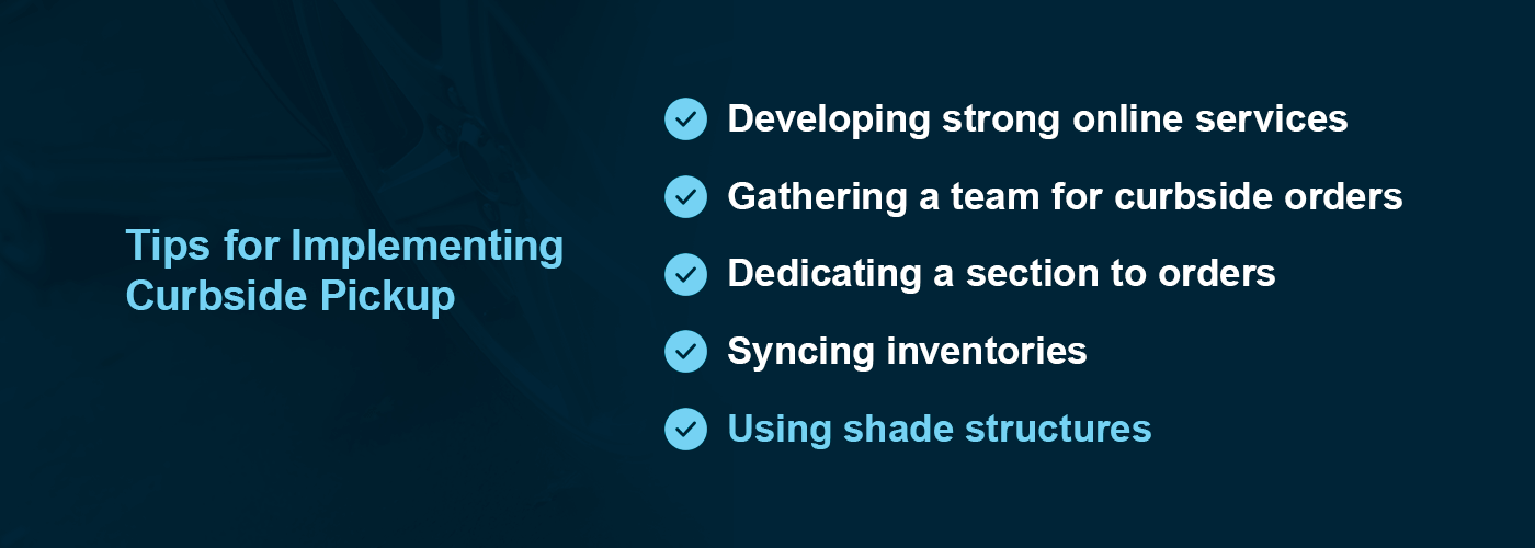 - Using shade structures: You can help provide weather protection for employees and highlight your designated curbside zones with shade structures. These structures can benefit your business and curbside services, further enhancing them.