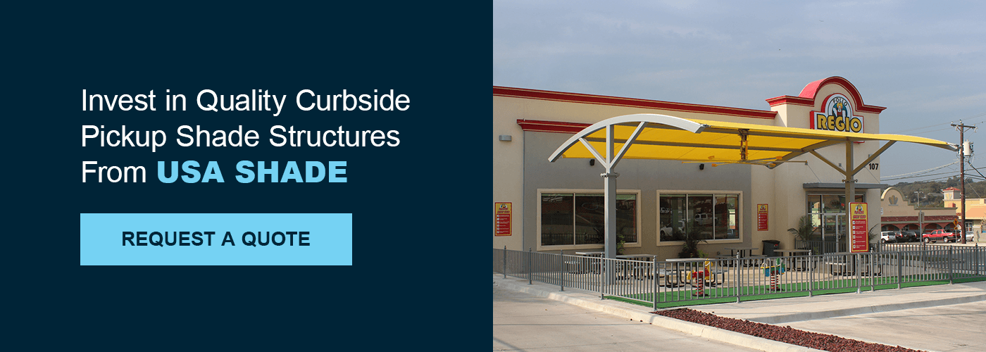 - Reducing heat: Because curbside pickup requires customers to wait on the blacktop or pavement while employees prepare their orders, sunny days can increase heat. Blacktop can heat quickly on warm and sunny days. Create comfortable spaces for waiting customers and employees by adding shade structures, which can reduce heat by 20°F in covered areas.