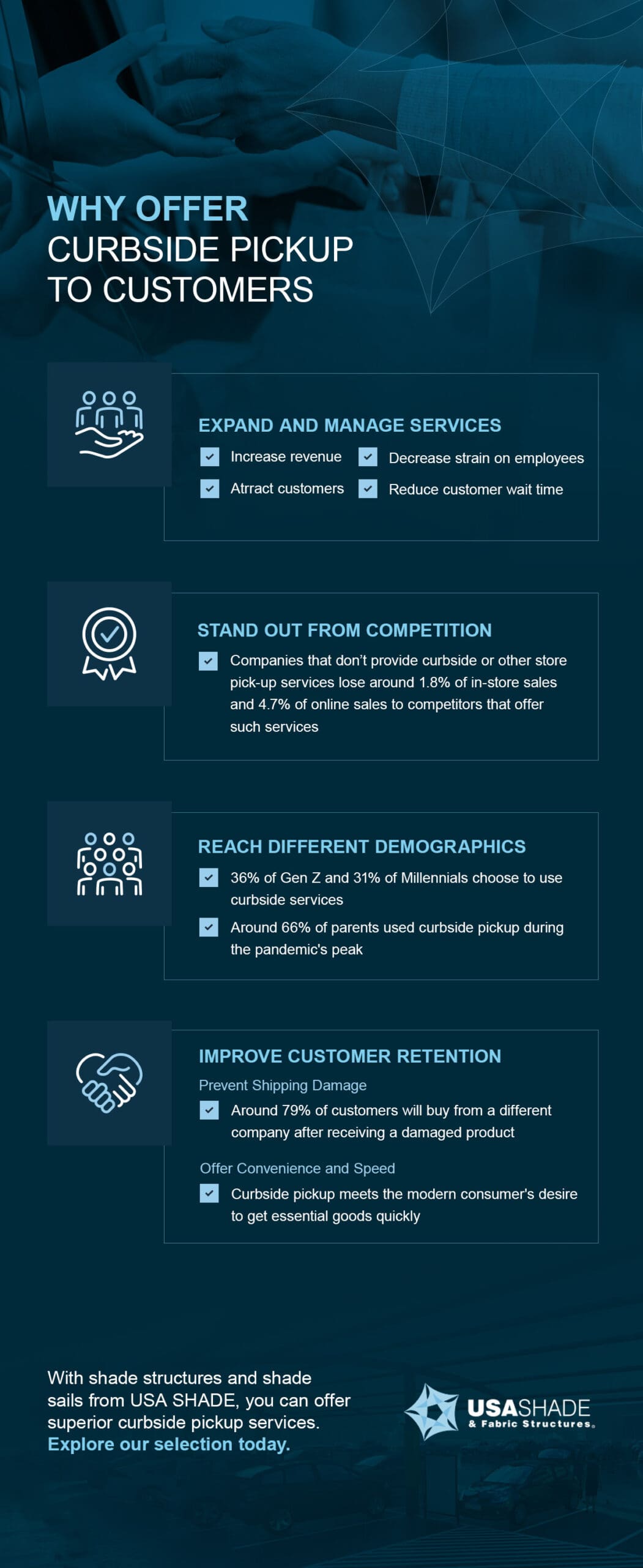If you are searching for ways to enhance your curbside pickup service, physical architecture like shade structures can be highly beneficial. Shade structures offer covered protection over your designated curbside pickup area, which can help guide customers where they need to be to pick up items. This method can provide several benefits for customers and employees, including: