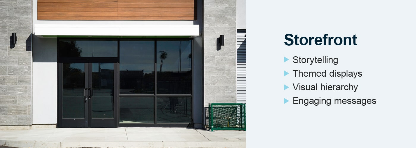 - Visual hierarchy: Strategically arrange your products in the display to guide the viewer’s eye. Highlight featured items, new arrivals or bestsellers to create focal points that draw attention and entice customers to enter your store.